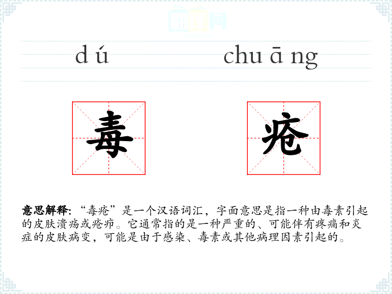 “毒疮”是一个汉语词汇,字面意思是指一种由毒素引起的皮肤溃疡或疮疖。它通常指的是一种严重的、可能伴有疼痛和炎症的皮肤病变,可能是由于感染、毒素或其他病理因素引起的。