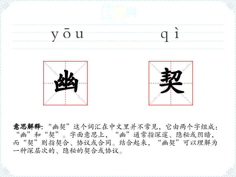 “幽契”这个词汇的词源较为模糊,它可能是由“幽”和“契”两个常用词汇组合而成的新词,用以表达一种深层次的契合状态。在古代文献中,可能较少见到这个词汇的使用,它更多地出现在现代文学或专业讨论中。