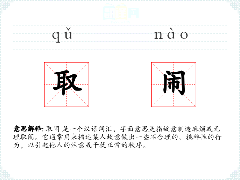 取闹 是一个汉语词汇,字面意思是指故意制造麻烦或无理取闹。它通常用来描述某人故意做出一些不合理的、挑衅性的行为,以引起他人的注意或干扰正常的秩序。