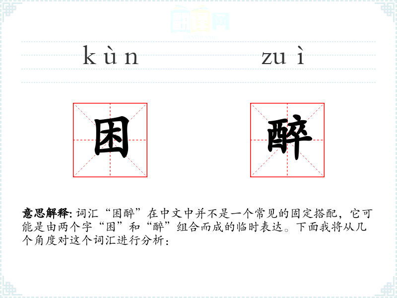 词汇“困醉”在中文中并不是一个常见的固定搭配,它可能是由两个字“困”和“醉”组合而成的临时表达。下面我将从几个角度对这个词汇进行分析: