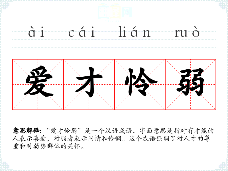 “爱才怜弱”是一个汉语成语,字面意思是指对有才能的人表示喜爱,对弱者表示同情和怜悯。这个成语强调了对人才的尊重和对弱势群体的关怀。