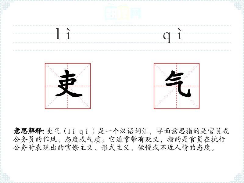吏气(lì qì)是一个汉语词汇,字面意思指的是官员或公务员的作风、态度或气质。它通常带有贬义,指的是官员在执行公务时表现出的官僚主义、形式主义、傲慢或不近人情的态度。