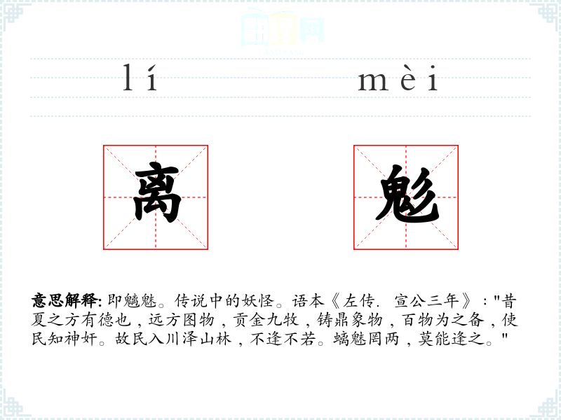 即魑魅。传说中的妖怪。语本《左传.宣公三年》﹕"昔夏之方有德也﹐远方图物﹐贡金九牧﹐
