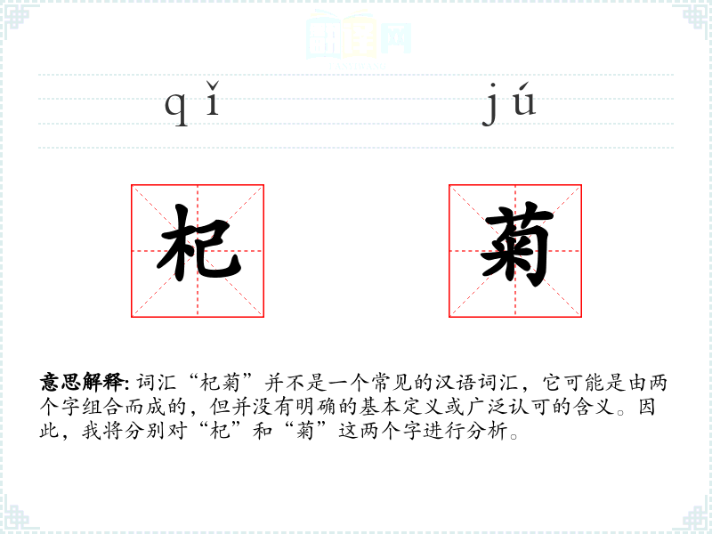 词汇“杞菊”并不是一个常见的汉语词汇,它可能是由两个字组合而成的,但并没有明确的基本定义或广泛认可的含义。因此,我将分别对“杞”和“菊”这两个字进行分析。