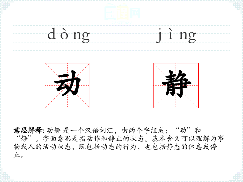 动静 是一个汉语词汇,由两个字组成:“动”和“静”。字面意思是指动作和静止的状态。基本含义可以理解为事物或人的活动状态,既包括动态的行为,也包括静态的休息或停止。