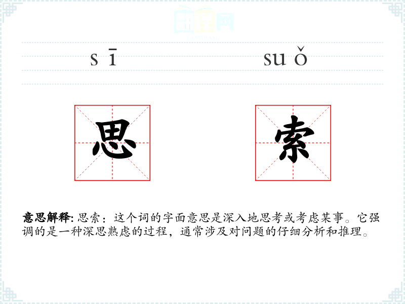 思索:这个词的字面意思是深入地思考或考虑某事。它强调的是一种深思熟虑的过程,通常涉及对问题的仔细分析和推理。