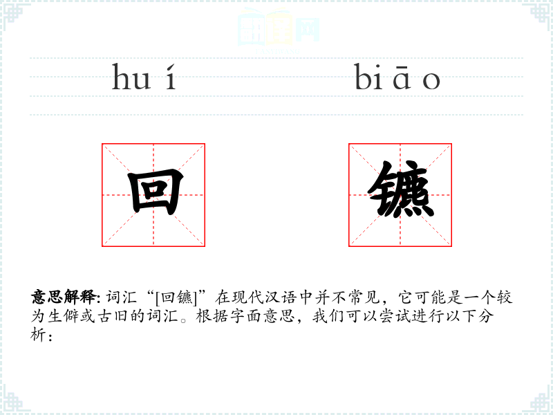 词汇“[回镳]”在现代汉语中并不常见,它可能是一个较为生僻或古旧的词汇。根据字面意思,我们可以尝试进行以下分析: