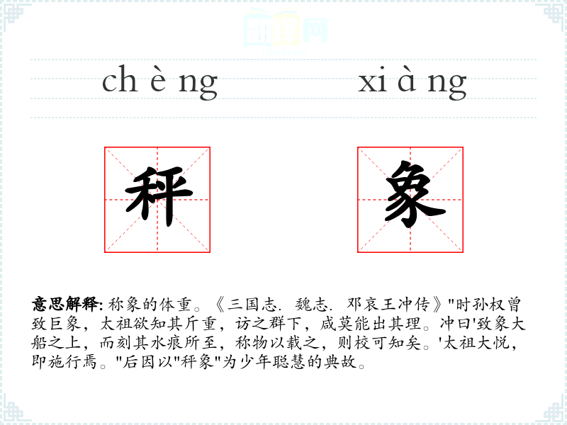 1.称象的体重。《三国志.魏志.邓哀王冲传》"时孙权曾致巨象,太祖欲知其斤重,访之群下,咸莫能出其理。冲曰'致象大船之上,而刻其水痕所至,称物以载之,则校可知矣。'太祖大悦,即施行焉。"后因以"秤象"为少年聪慧的典故。