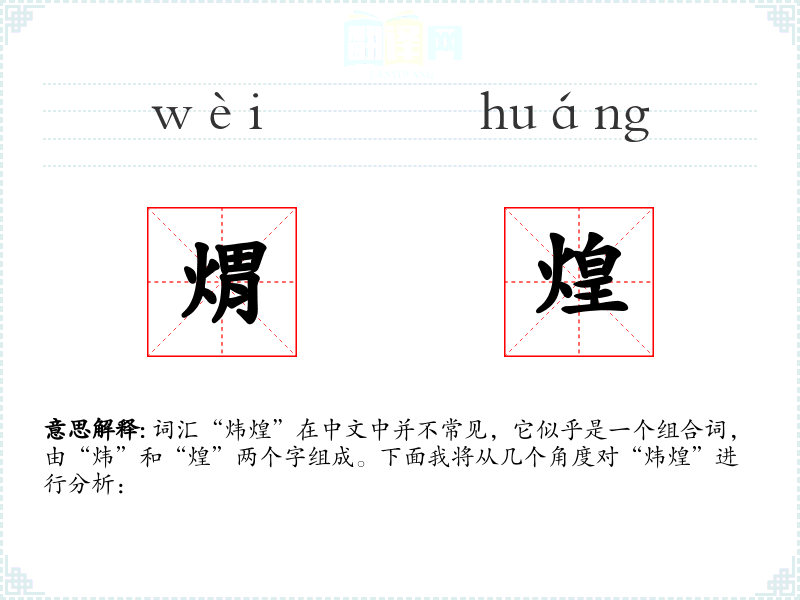 词汇“炜煌”在中文中并不常见,它似乎是一个组合词,由“炜”和“煌”两个字组成。下面我将从几个角度对“炜煌”进行分析: