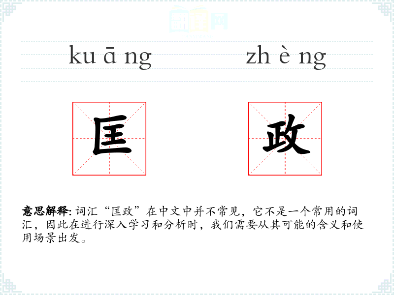 词汇“匡政”在中文中并不常见,它不是一个常用的词汇,因此在进行深入学*和分析时,我们需要从其可能的含义和使用场景出发。