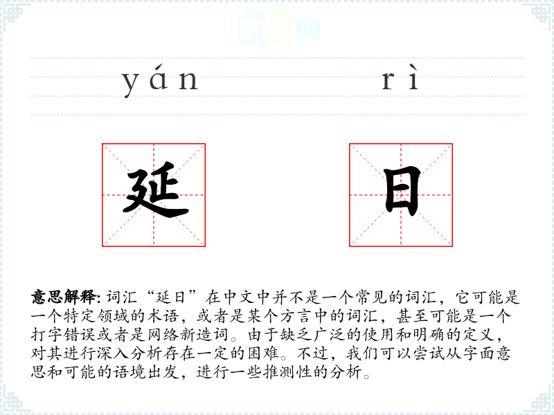 由于“延日”不是一个标准词汇,对其的理解和应用需要谨慎。在语言学习和表达中,了解词汇的准确含义和使用语境是非常重要的。如果“延日”是一个特定领域的术语,那么在相关领域工作或学习时,了解其含义将有助于更好地沟通和理解。
