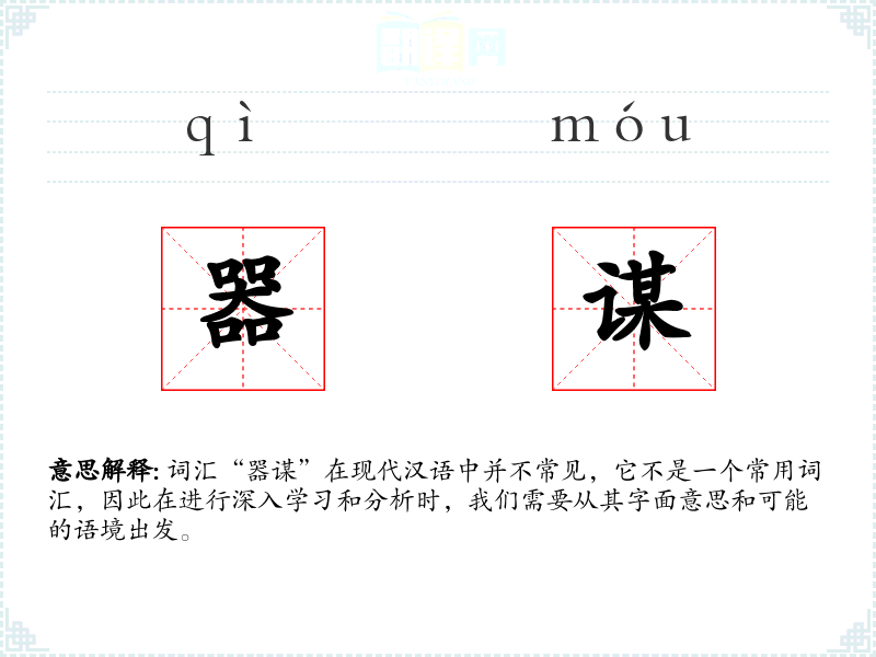 词汇“器谋”在现代汉语中并不常见,它不是一个常用词汇,因此在进行深入学*和分析时,我们需要从其字面意思和可能的语境出发。