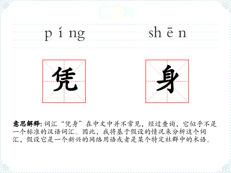 词汇“凭身”在中文中并不常见,经过查询,它似乎不是一个标准的汉语词汇。因此,我将基于假设的情况来分析这个词汇,假设它是一个新兴的网络用语或者是某个特定社群中的术语。