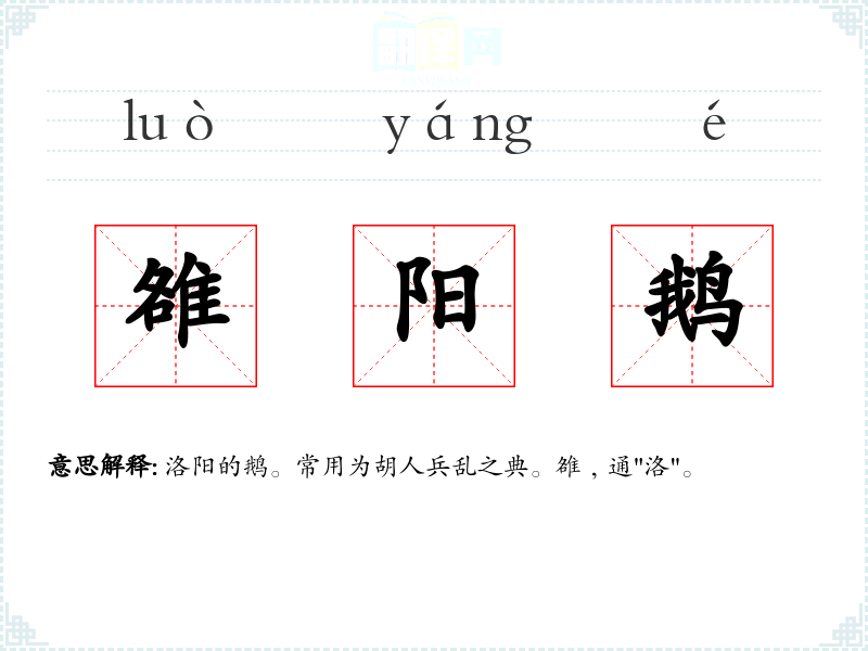 洛阳的鹅。常用为胡人兵乱之典。雒﹐通"洛"。