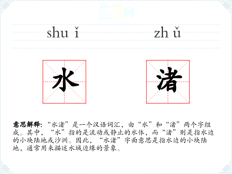 同义词中,“洲”和“沙洲”与“水渚”意思相近,但“洲”更常指较大的陆地,而“沙洲”特指由沙子构成的洲。反义词则与“水渚”形成对比,强调水体的广阔或深邃。