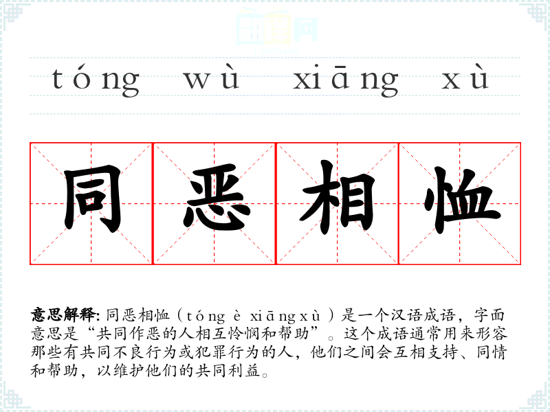同恶相恤(tóng è xiāng xù)是一个汉语成语,字面意思是“共同作恶的人相互怜悯和帮助”。这个成语通常用来形容那些有共同不良行为或犯罪行为的人,他们之间会互相支持、同情和帮助,以维护他们的共同利益。