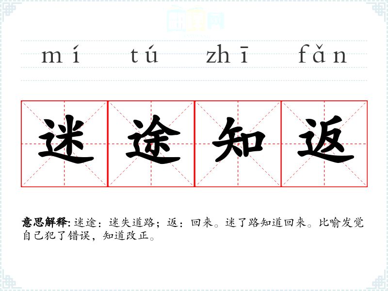 迷途:迷失道路;返:回来。迷了路知道回来。比喻发觉自己犯了错误,知道改正。