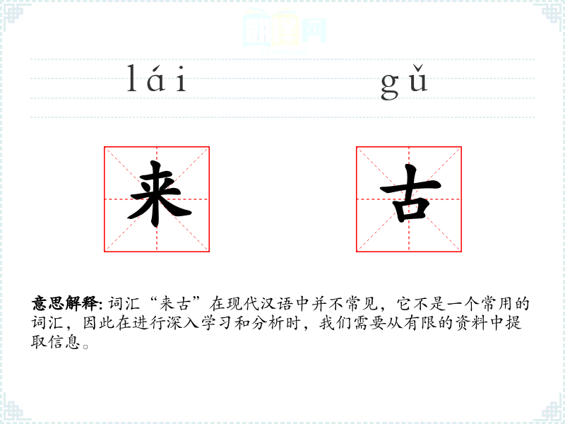 “来古”字面意思可能是“来自古代”或“古代的”。然而,由于这个词汇不常见,它的确切含义可能需要结合具体语境来确定。