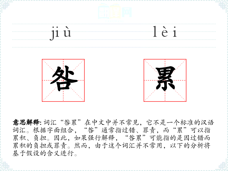 词汇“咎累”在中文中并不常见,它不是一个标准的汉语词汇。根据字面组合,“咎”通常指过错、罪责,而“累”可以指累积、负担。因此,如果强行解释,“咎累”可能指的是因过错而累积的负担或罪责。然而,由于这个词汇并不常用,以下的分析将基于假设的含义进行。