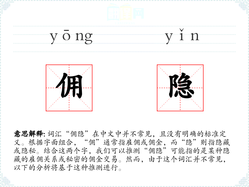 词汇“佣隐”在中文中并不常见,且没有明确的标准定义。根据字面组合,“佣”通常指雇佣或佣金,而“隐”则指隐藏或隐秘。结合这两个字,我们可以推测“佣隐”可能指的是某种隐藏的雇佣关系或秘密的佣金交易。然而,由于这个词汇并不常见,以下的分析将基于这种推测进行。