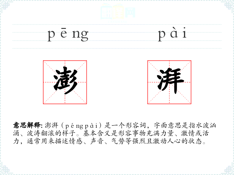 澎湃(péng pài)是一个形容词,字面意思是指水波汹涌、波涛翻滚的样子。基本含义是形容事物充满力量、激情或活力,通常用来描述情感、声音、气势等强烈且激动人心的状态。