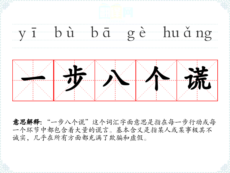 “一步八个谎”这个词汇字面意思是指在每一步行动或每一个环节中都包含着大量的谎言。基本含义是指某人或某事极其不诚实,几乎在所有方面都充满了欺骗和虚假。