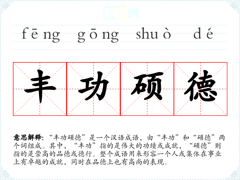 “丰功硕德”是一个汉语成语,由“丰功”和“硕德”两个词组成。其中,“丰功”指的是伟大的功绩或成就,“硕德”则指的是崇高的品德或德行。整个成语用来形容一个人或集体在事业上有卓越的成就,同时在品德上也有高尚的表现。