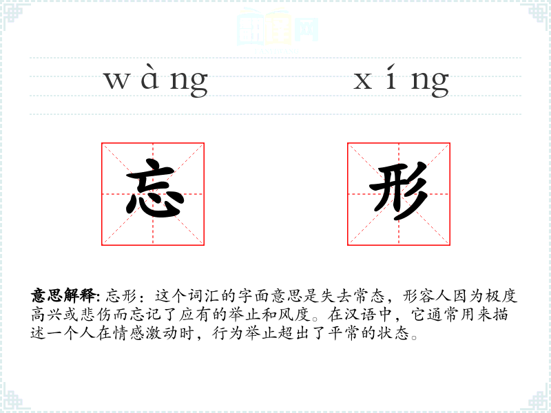 忘形:这个词汇的字面意思是失去常态,形容人因为极度高兴或悲伤而忘记了应有的举止和风度。在汉语中,它通常用来描述一个人在情感激动时,行为举止超出了平常的状态。