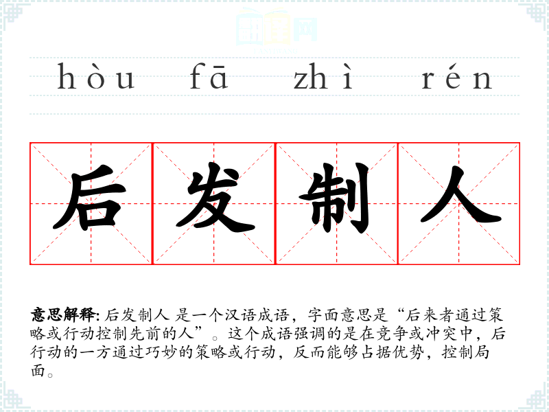 后发制人 是一个汉语成语,字面意思是“后来者通过策略或行动控制先前的人”。这个成语强调的是在竞争或冲突中,后行动的一方通过巧妙的策略或行动,反而能够占据优势,控制局面。