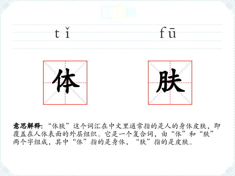 “体肤”这个词汇在中文里通常指的是人的身体皮肤,即覆盖在人体表面的外层组织。它是一个复合词,由“体”和“肤”两个字组成,其中“体”指的是身体,“肤”指的是皮肤。
