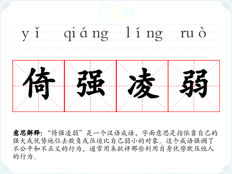 “倚强凌弱”是一个汉语成语,字面意思是指依靠自己的强大或优势地位去欺负或压迫比自己弱小的对象。这个成语强调了不公平和不正义的行为,通常用来批评那些利用自身优势欺压他人的行为。