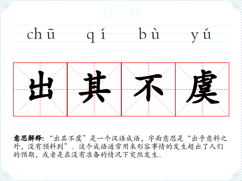 “出其不虞”是一个汉语成语,字面意思是“出乎意料之外,没有预料到”。这个成语通常用来形容事情的发生超出了人们的预期,或者是在没有准备的情况下突然发生。
