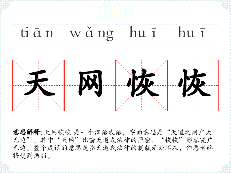 天网恢恢 是一个汉语成语,字面意思是“天道之网广大无边”,其中“天网”比喻天道或法律的严密,“恢恢”形容宽广无边。整个成语的意思是指天道或法律的制裁无处不在,作恶者终将受到惩罚。