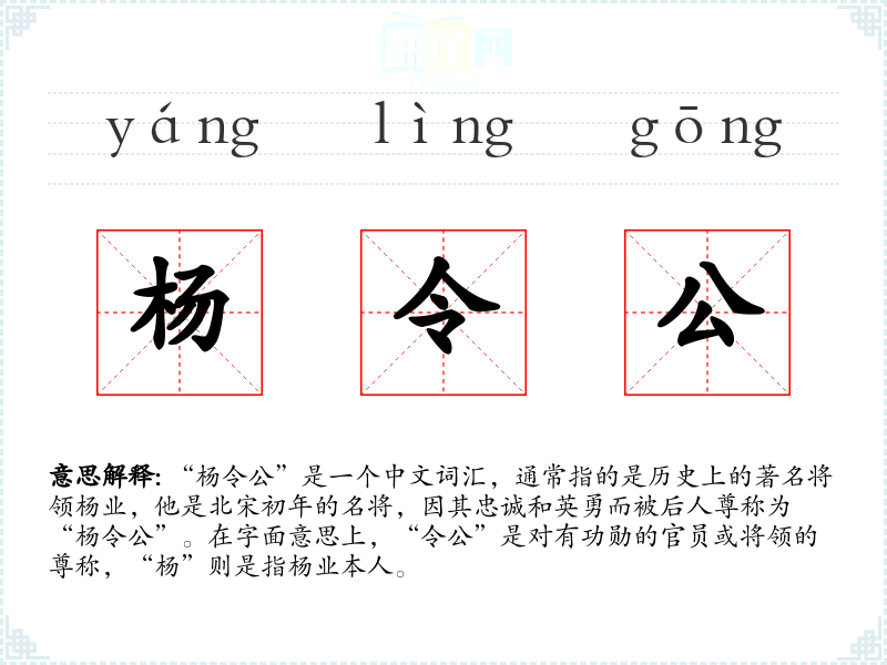“杨令公”是一个中文词汇,通常指的是历史上的著名将领杨业,他是北宋初年的名将,因其忠诚和英勇而被后人尊称为“杨令公”。在字面意思上,“令公”是对有功勋的官员或将领的尊称,“杨”则是指杨业本人。