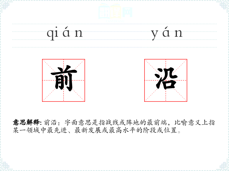 前沿:字面意思是指战线或阵地的最前端,比喻意义上指某一领域中最先进、最新发展或最高水平的阶段或位置。