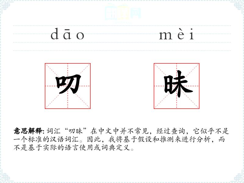 词汇“叨昧”在中文中并不常见,经过查询,它似乎不是一个标准的汉语词汇。因此,我将基于假设和推测来进行分析,而不是基于实际的语言使用或词典定义。