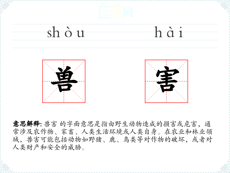 “兽害”这个词反映了人类与自然界互动的一个复杂方面,它不仅涉及具体的损害问题,也触及到生态平衡、动物保护和人类利益的深层次议题。在语言学*和表达中,理解和正确使用这个词有助于更准确地描述和解决相关问题。