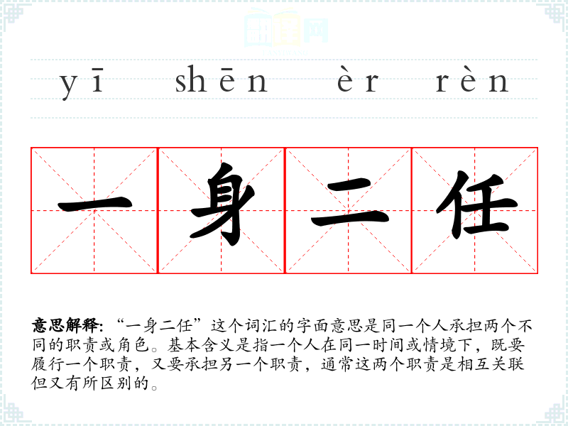 “一身二任”这个词汇的字面意思是同一个人承担两个不同的职责或角色。基本含义是指一个人在同一时间或情境下,既要履行一个职责,又要承担另一个职责,通常这两个职责是相互关联但又有所区别的。