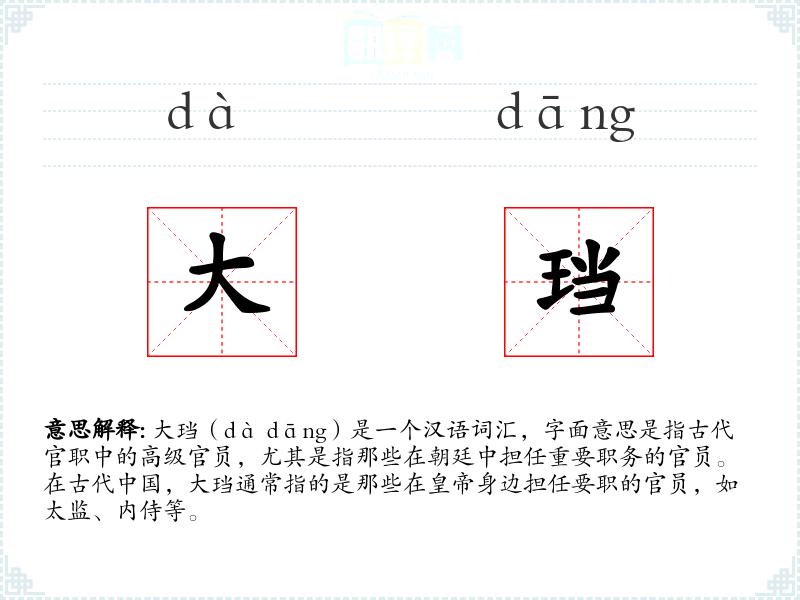 大珰(dà dāng)是一个汉语词汇,字面意思是指古代官职中的高级官员,尤其是指那些在朝廷中担任重要职务的官员。在古代,大珰通常指的是那些在身边担任要职的官员,如太监、内侍等。