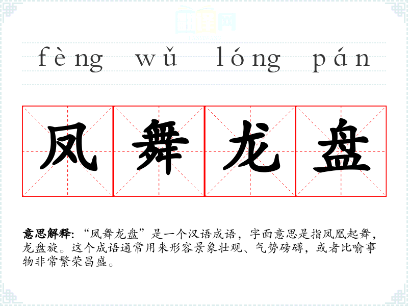 “凤舞龙盘”是一个汉语成语,字面意思是指凤凰起舞,龙盘旋。这个成语通常用来形容景象壮观、气势磅礴,或者比喻事物非常繁荣昌盛。