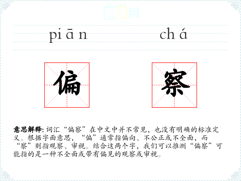 词汇“偏察”在中文中并不常见,也没有明确的标准定义。根据字面意思,“偏”通常指偏向、不公正或不全面,而“察”则指观察、审视。结合这两个字,我们可以推测“偏察”可能指的是一种不全面或带有偏见的观察或审视。