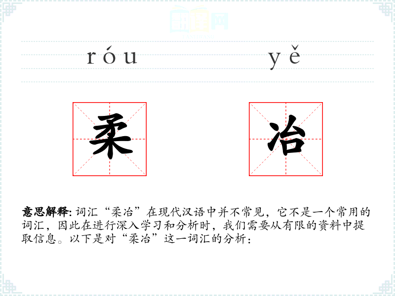 词汇“柔冶”在现代汉语中并不常见,它不是一个常用的词汇,因此在进行深入学习和分析时,我们需要从有限的资料中提取信息。以下是对“柔冶”这一词汇的分析: