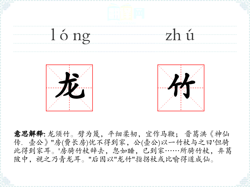 1.龙须竹。劈为篾,平细柔韧,宜作马鞭; 晋葛洪《神仙传.壶公》"房(费长房)忧不得到家,公(壶公)以一竹杖与之曰'但骑此得到家耳。'房骑竹杖辞去,忽如睡,已到家……所骑竹杖,弃葛陂中,视之乃青龙耳。"后因以"龙竹"指拐杖或比喻得道成仙。