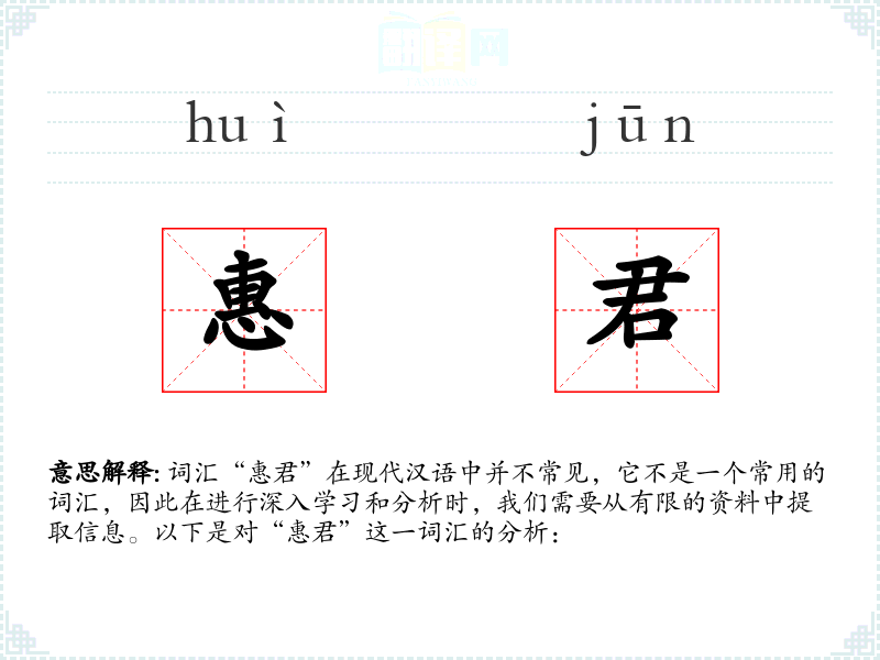- 反义词:无(由于“惠君”不常用,反义词难以确定)