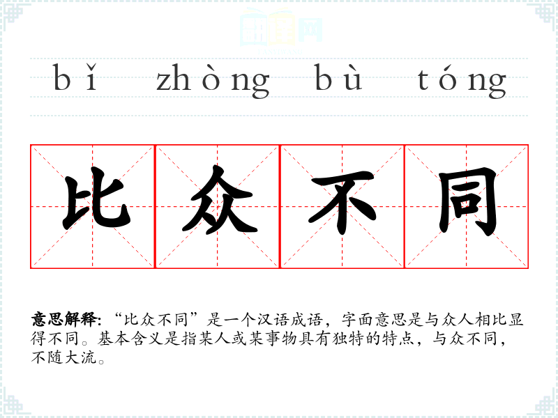“比众不同”是一个汉语成语,字面意思是与众人相比显得不同。基本含义是指某人或某事物具有独特的特点,与众不同,不随大流。