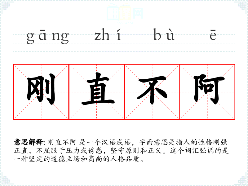 刚直不阿 是一个汉语成语,字面意思是指人的性格刚强正直,不屈服于压力或诱惑,坚守原则和正义。这个词汇强调的是一种坚定的道德立场和高尚的人格品质。