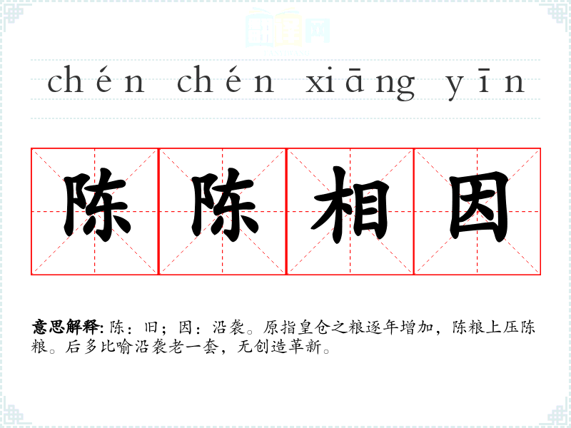 陈:旧;因:沿袭。原指皇仓之粮逐年增加,陈粮上压陈粮。后多比喻沿袭老一套,无创造革新。