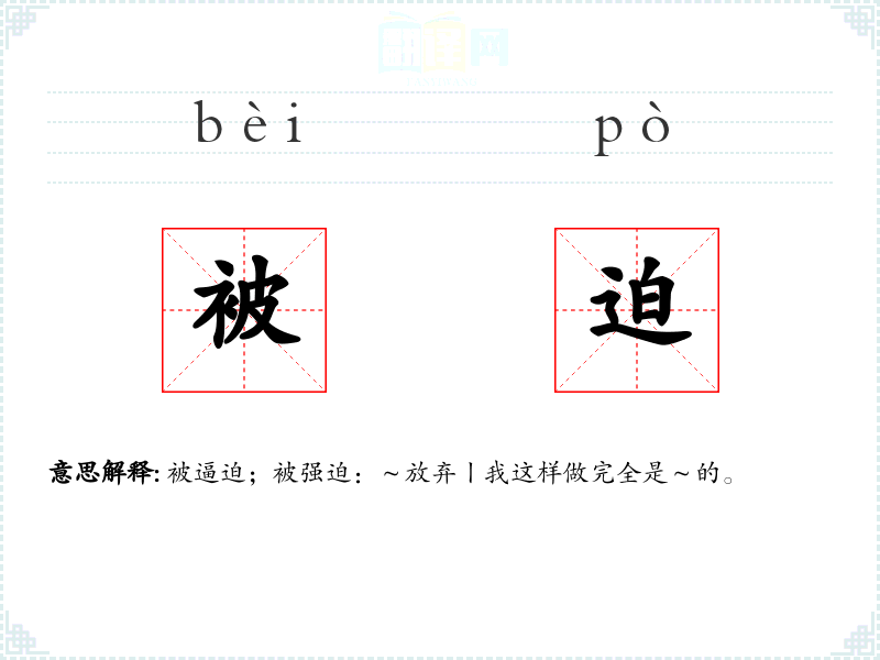 被逼迫;被强迫:~放弃丨我这样做完全是~的。