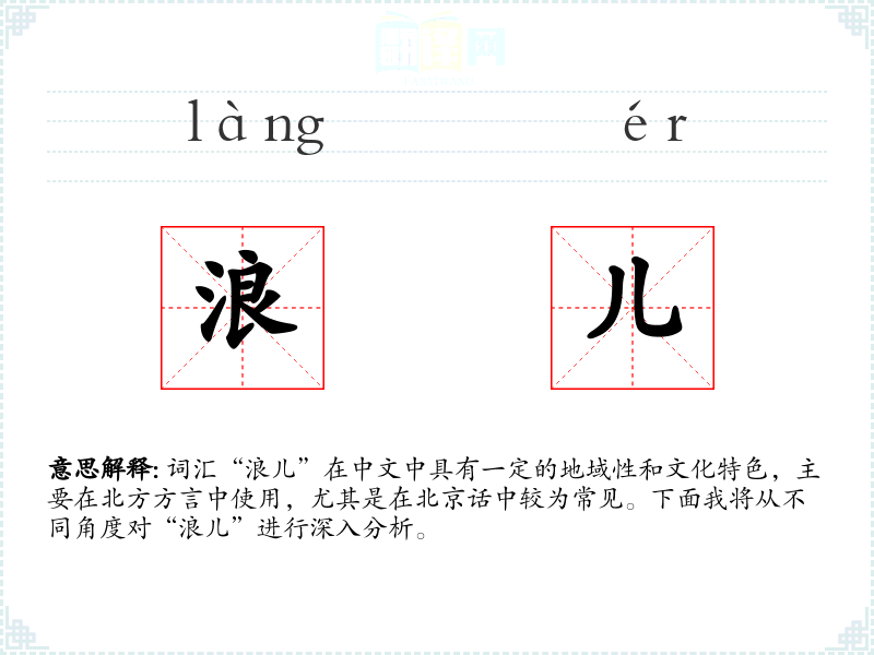 词汇“浪儿”在中文中具有一定的地域性和文化特色,主要在北方方言中使用,尤其是在北京话中较为常见。下面我将从不同角度对“浪儿”进行深入分析。