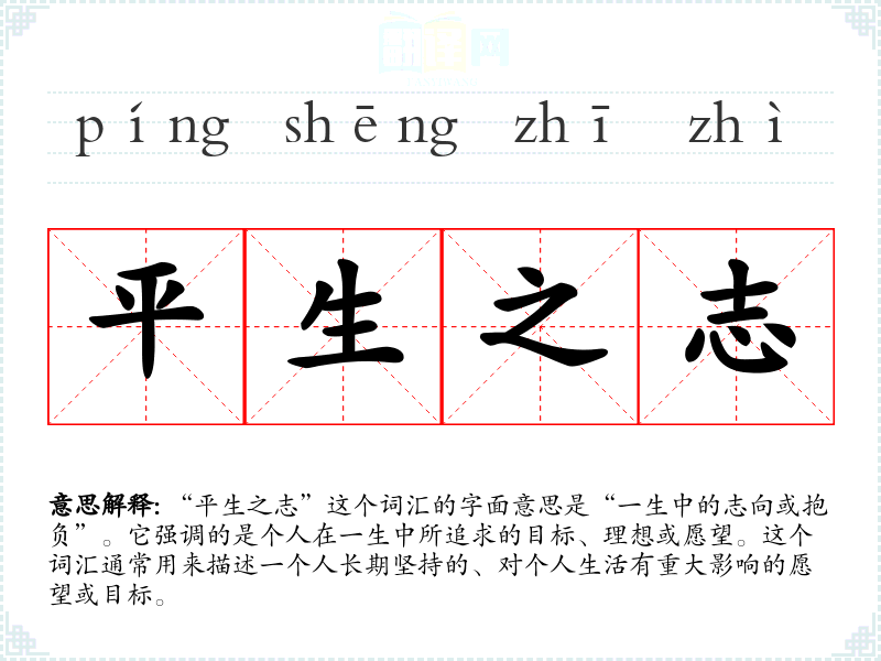 “平生之志”这个词汇的字面意思是“一生中的志向或抱负”。它强调的是个人在一生中所追求的目标、理想或愿望。这个词汇通常用来描述一个人长期坚持的、对个人生活有重大影响的愿望或目标。